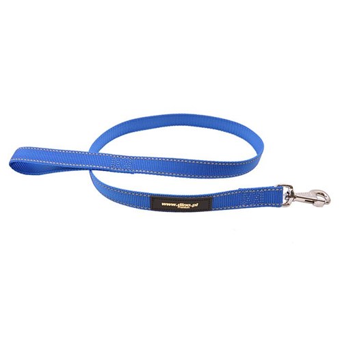 Smycz z wyjątkowo wytrzymałej taśmy polipropylenowej. Brzegi przeszyte odblaskową nicią. Szer. 25mm. Dł. 120cm.
