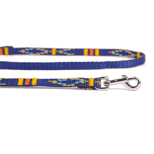 Smycz z taśmy żakardowej. Jest wyjątkowo lekka i wygodna. Taśma jest gładka i łatwa w konserwacji. Smycz zdobią piękne etniczne wzory. Kolor granatowy, szer. 10mm, dł. 120cm.