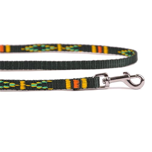 Smycz z taśmy żakardowej. Jest wyjątkowo lekka i wygodna. Taśma jest gładka i łatwa w konserwacji. Smycz zdobią piękne etniczne wzory. Kolor zielony, szer. 10mm, dł. 120cm.