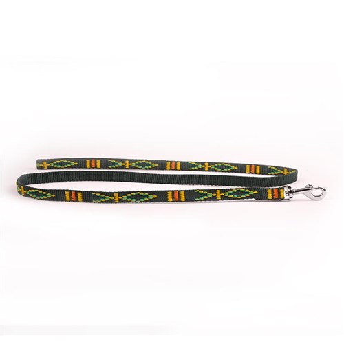 Smycz z taśmy żakardowej jest wyjątkowo lekka i wygodna. Taśma jest gładka i łatwa w konserwacji. Smycz zdobią piękne etniczne wzory. Kolor zielony, szer. 13mm, dł. 120cm.