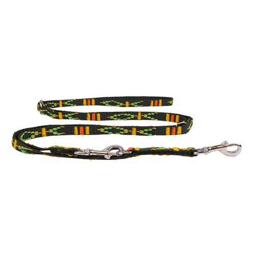 Smycz z taśmy żakardowej z funkcją składania. Jest wyjątkowo lekka i wygodna. Taśma jest gładka i łatwa w konserwacji. Smycz zdobią piękne etniczne wzory. Kolor zielony, szer. 1,3mm, dł. 200cm.
