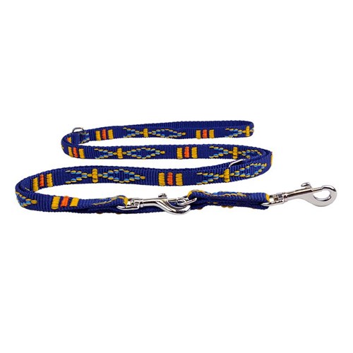Smycz z taśmy żakardowej z funkcją składania. Jest wyjątkowo lekka i wygodna. Taśma jest gładka i łatwa w konserwacji. Smycz zdobią piękne etniczne wzory. Kolor granatowy, szer. 15mm., dł. 200cm.
