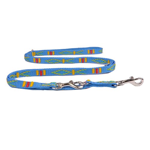 Smycz z taśmy żakardowej z funkcją składania. Jest wyjątkowo lekka i wygodna. Taśma jest gładka i łatwa w konserwacji. Smycz zdobią piękne etniczne wzory. Kolor niebieski, szer. 15mm., dł. 200cm.