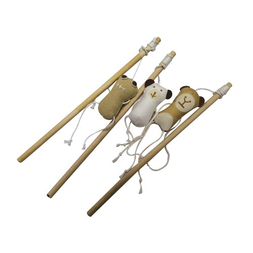 Zabawka dla kota z płóciennymi figórkami. Stonowane kolory i staranność wykonania wyróżniają ten produkt. Zabawki umocowane są do plastikowego giętkiego patyka, wykonanego z nietoksycznego tworzywa.