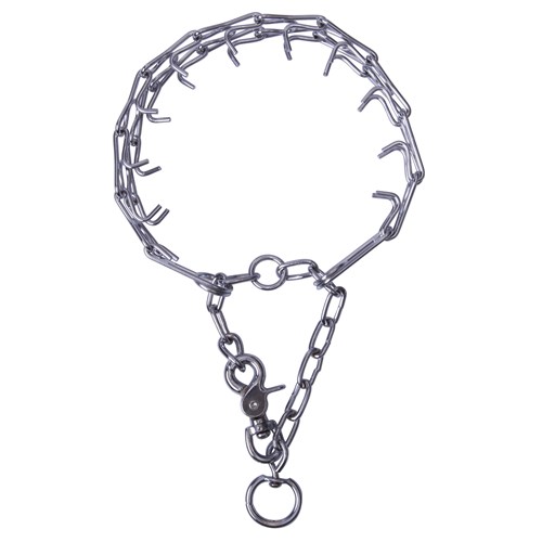 Wykonana z metalu pokrytego warstwą ochronną chromu zapobiegającą korozji i przecieraniu. Posiada blokadę, aby obroża nie zacisnęła się zbyt mocno.Karabinek pozwala w łatwy i szybki sposób zdjąć kolczatkę.