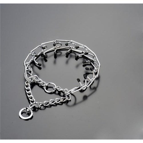 Wykonana z metalu pokrytego warstwą ochronną chromu zapobiegającą korozji i przecieraniu. Posiada dodatkowo plastikowe nakładki na kolcach, które stanowią dodatkową osłonę chroniąc szyję twojego psa. Szer.2.5mm. Obw. 45cm.