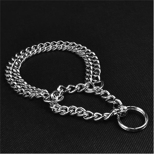 Wykonana z metalu pokrytego warstwą ochronną chromu zapobiegającą korozji i przecieraniu. Dzięki zeszlifowanym ogniwom efektownie odbija światło. Posiada blokadę, aby obroża nie zacisnęła się zbyt mocno. Szer. 2,5cm. Obw. 45cm.