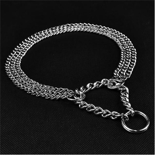 Wykonana z metalu pokrytego warstwą ochronną chromu zapobiegającą korozji i przecieraniu. Dzięki zeszlifowanym ogniwom efektownie odbija światło. Posiada blokadę, aby obroża nie zacisnęła się zbyt mocno. Szer. 2,5cm. Obw. 50cm.