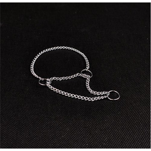 Obroża łańcuszkowa wykonana z metalu pokrytego warstwą ochronną chromu zapobiegającą korozji, posiada ogranicznik, aby obroża nie zacisnęła się zbyt mocno. Szer. 13,5mm. Obw. 30cm.