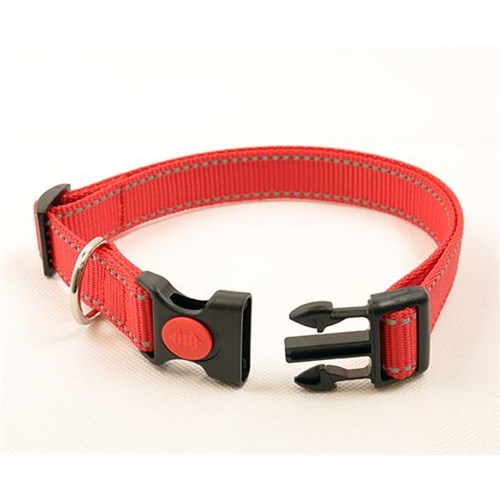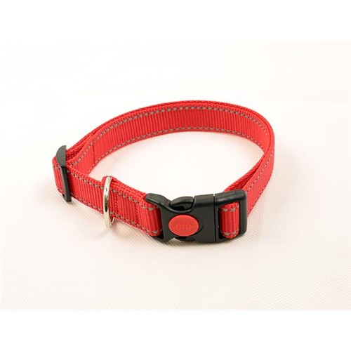 Obroża z wyjątkowo wytrzymałej taśmy polipropylenowej. Brzegi przeszyte odblaskową nicią. Klamra z zabezpieczeniem "Safety Click". Szer.15mm. Dł. 30-42cm.