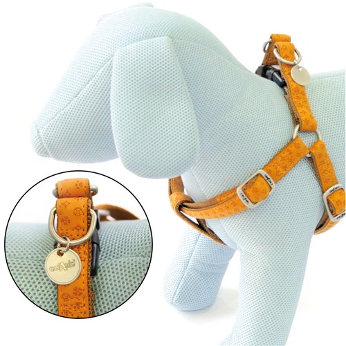 Szelki ze skóry ekologicznej z tłoczonym wzorem. Regulacja wielkości w okolicach szyi i klatki piersiowej. Wymiary: Obwód: 60-100cm. Szerokość: 2,5cm.