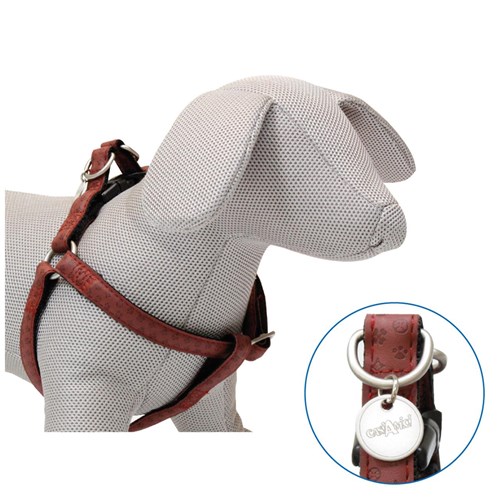 Szelki ze skóry ekologicznej z tłoczonym wzorem. Regulacja wielkości w okolicach szyi i klatki piersiowej. Wymiary: Obwód: 35-60cm.