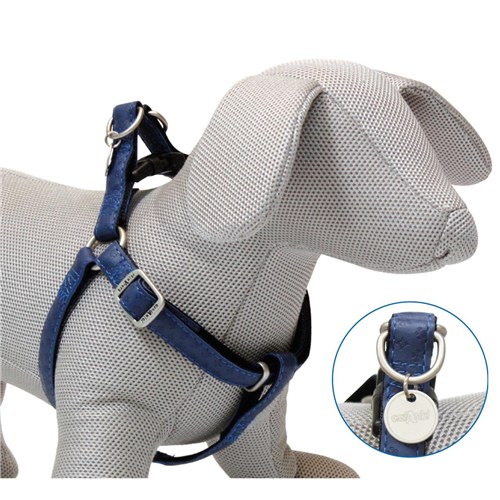 Szelki ze skóry ekologicznej z tłoczonym wzorem. Regulacja wielkości w okolicach szyi i klatki piersiowej. Wymiary: Obwód: 60-100cm. Szerokość: 2,5cm.