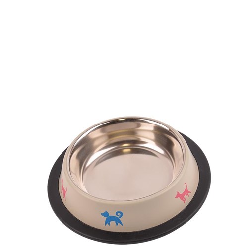 Miska metalowa dla psa. Farby użyte do zdobienia są bezpieczne i trwałe. Dodatkowo miska posiada antypoślizgową gumę zapobiegającą rysowaniu podłóg. Gumę można bardzo łatwo zdjąć, dzięki czemu miska nadaje się do mycia w zmywarce. Pojemność: 0,24 l