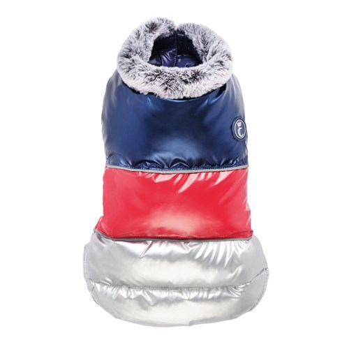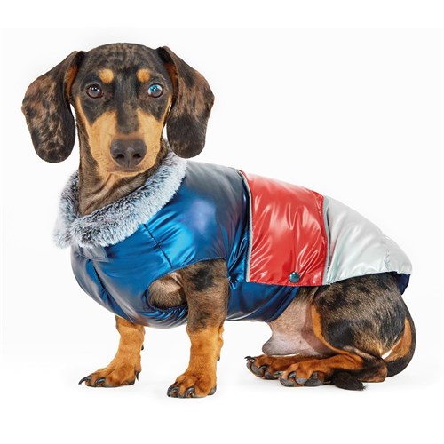 Wodoodporna kurteczka z efektem puchu. Lekka i praktyczna, zapinana na zatrzaski. Kolnierz wykonany z eko futerka. Idealne dopasowanie zapewniaja gumki wszyte na brzuchu oraz w okolicy tylnych lap. Kurteczke mozna prac w pralce w temperaturze 30°.