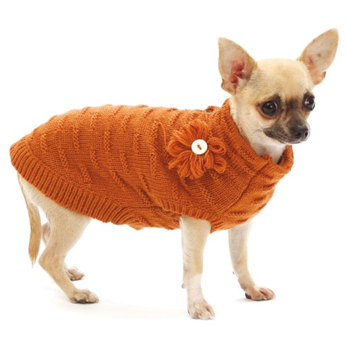 Bardzo miekki i cieply sweterek dla psów z poliestru. Przy szyi ozdoba w ksztalcie kwiatu z ozdobnym guzikiem. Wyposazony w elastyczne opaski na tylne lapy oraz otwór na smycz.