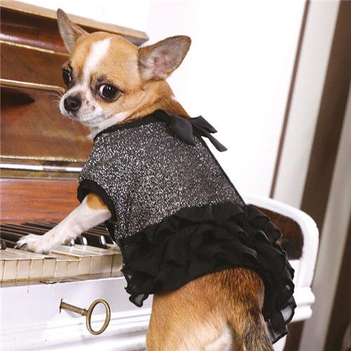 Piekna blyszczaca sukienka z czarna szyfonowa falbanka.To idealne rozwiazanie na wyjatkowe okazje. Zapiecie na zatrzaski oraz elastyczne opaski na tylne lapy gwarantuja maksymalne dopasowanie.