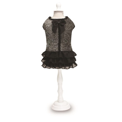 Piekna blyszczaca sukienka z czarna szyfonowa falbanka.To idealne rozwiazanie na wyjatkowe okazje. Zapiecie na zatrzaski oraz elastyczne opaski na tylne lapy gwarantuja maksymalne dopasowanie.