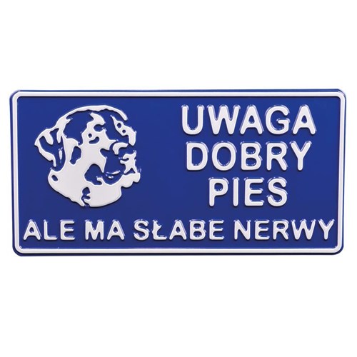 Tabliczkia metalowa ostrzegawcza. UWAGA DOBRY PIES ALE MA SŁABE NERWY Kolor tabliczki wybierany jest losowo. Rozmiar tabliczki 15x30 cm.