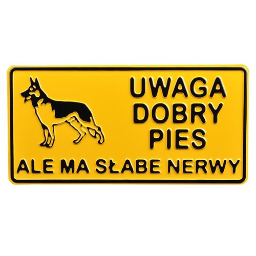 Tabliczkia metalowa ostrzegawcza. UWAGA DOBRY PIES ALE MA SŁABE NERWY Kolor tabliczki wybierany jest losowo. Rozmiar tabliczki 15x30 cm.
