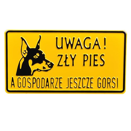 Tabliczkia metalowa ostrzegawcza. UWAGA ZŁY PIES A GOSPODARZE JESZCZE GORSI Kolor tabliczki wybierany jest losowo. Rozmiar tabliczki 15x30 cm.