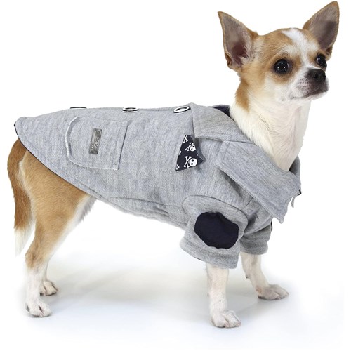 Elegancki bawelniany zakecik dla psa. Jest bardzo wygodny i przyjemny w dotyku. Zakiet wyposazony jest w ozdobne kieszonki, butonierke i naszywki. Idealne dopasowanie zapewniaja elastyczne opaski na tylne lapy oraz otwór na smycz.